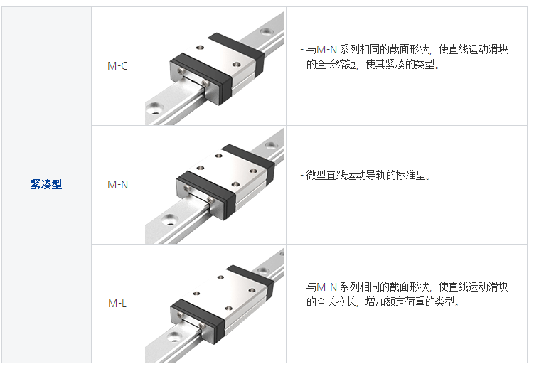 體積小、輕量化,滑塊主體的一部分采用了樹脂材料,重量減少約20%,特別適合小型化設備使用。不銹鋼材質之線性滑軌,包含滑塊、滑軌及其它金屬配件如鋼珠、保持器等,皆使用不銹鋼材質,具備防銹的特性。采用哥德型四點接觸設計,可承受各方向負荷,具備剛性強,精度高等特性。有鋼珠保持器設計,在精度允許下具備互換性。